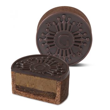 This stunning mooncake holds a layer of sweet speculoos filling and a layer of a dark chocolate filling, all held in a crispy chocolate tartlet shell.