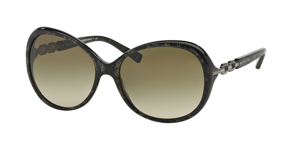 MK2008B -A look that evokes Old Hollywood glamour, this round, oversized frame is accented with chain link and pavé detailing. Available in black/silver, dark tortoise/gold, green sparkle/gunmetal, pink sparkle/rose gold, brown sparkle/gold and black/gold.