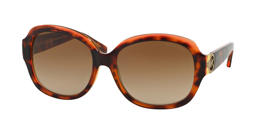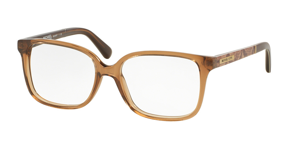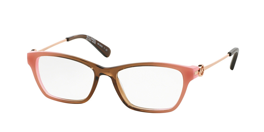 MK8005 – A glamorous rectangular shape enhances these optical styles featuring a punched charm detail inspired by the iconic Michael Kors charm logo. This model is available in a beautiful brown and rio coral ombré combination with rose gold temples.